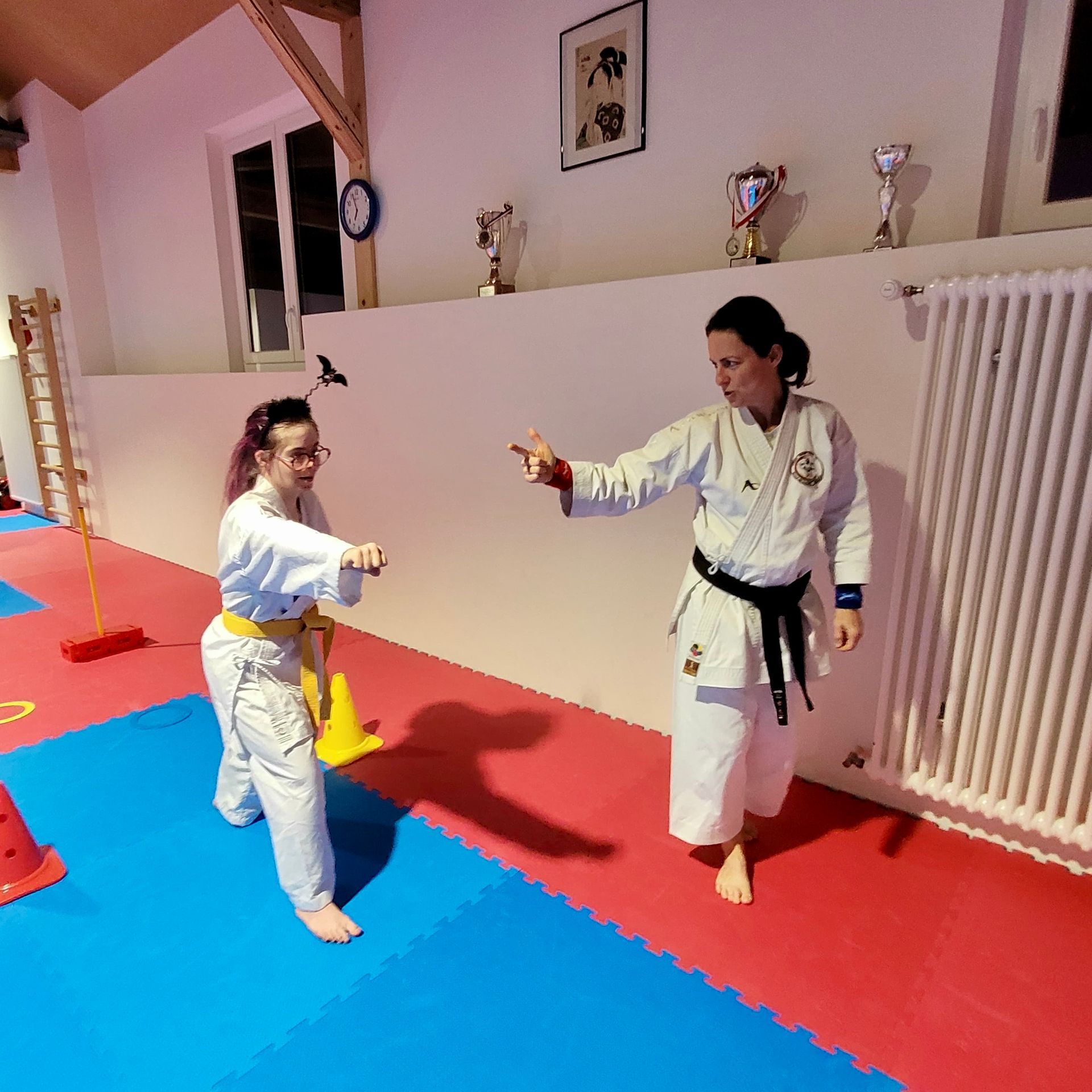 Je suis monitrice jeunesse et sport (J&S) + J&S des enfants, sport des adultes suisse (ESA) et monitrice de sport-handicap reconnue auprès de PluSport (Sport Handicap Suisse) et ceinture noire 5e Dan auprès de la Fédération Suisse de karaté (FSK) en style Goju-Ryu.